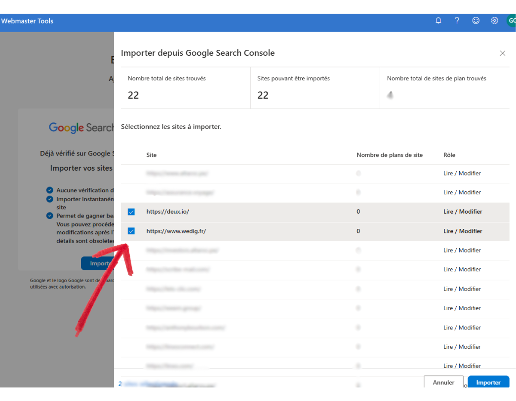 Importation des données : Pour gagner du temps, utilisez l’import automatique depuis la Google Search Console. Cela synchronise vos propriétés et vos sitemaps.