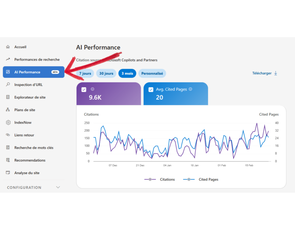 Dans le menu latéral gauche, sous la section « Performance », sélectionnez « AI Performance ». Notez que les données peuvent mettre 48h à 72h à se stabiliser après une modification majeure de votre site.