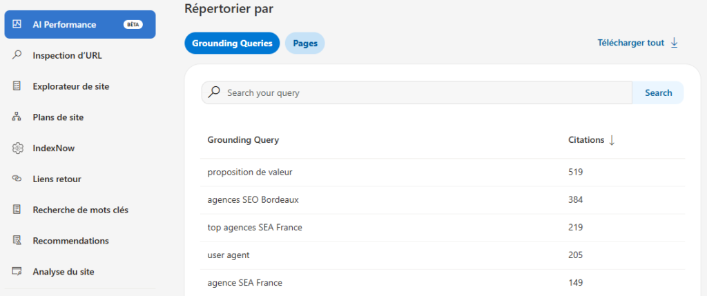 Bing AI Performance est un laboratoire. Pour chaque requête identifiée, effectuez un test « site search » croisé : [Grounding Query] + site:votredomaine.com (en remplaçant “votredomaine.com” par votre site) sur Google par exemple. Vous pourrez constater quelles sont les pages les mieux positionnées d’un point de vue SEO et vérifier leur présence dans les pages citées sur AI Performance.