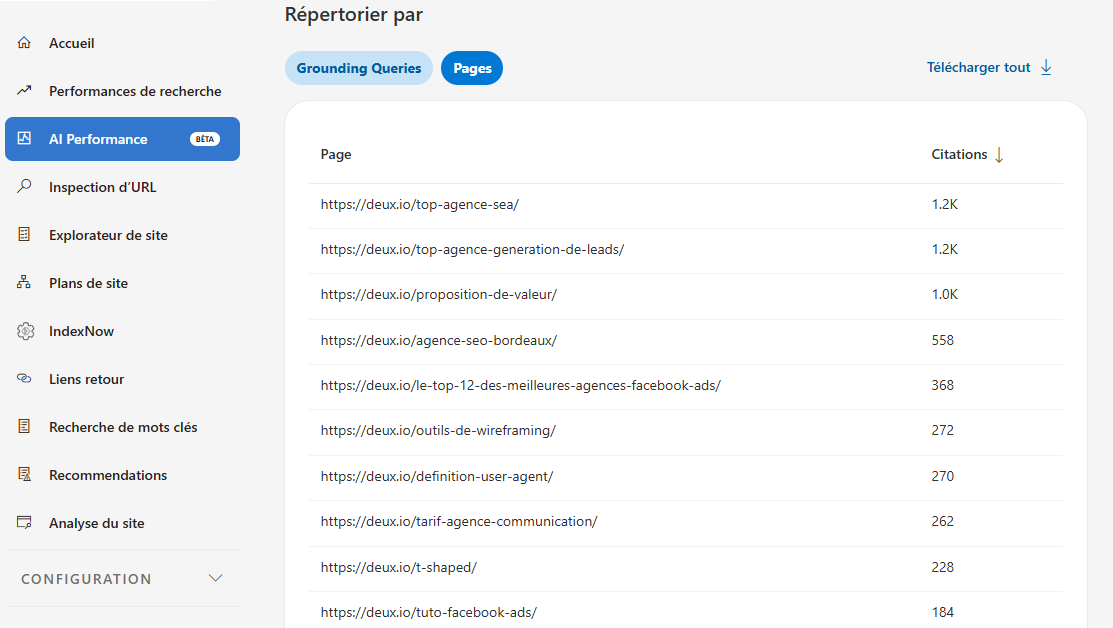 Cet indicateur liste les URLs de votre site les plus sollicitées par l’IA de Bing (Copilot) et les partenaires utilisant l’index Bing.